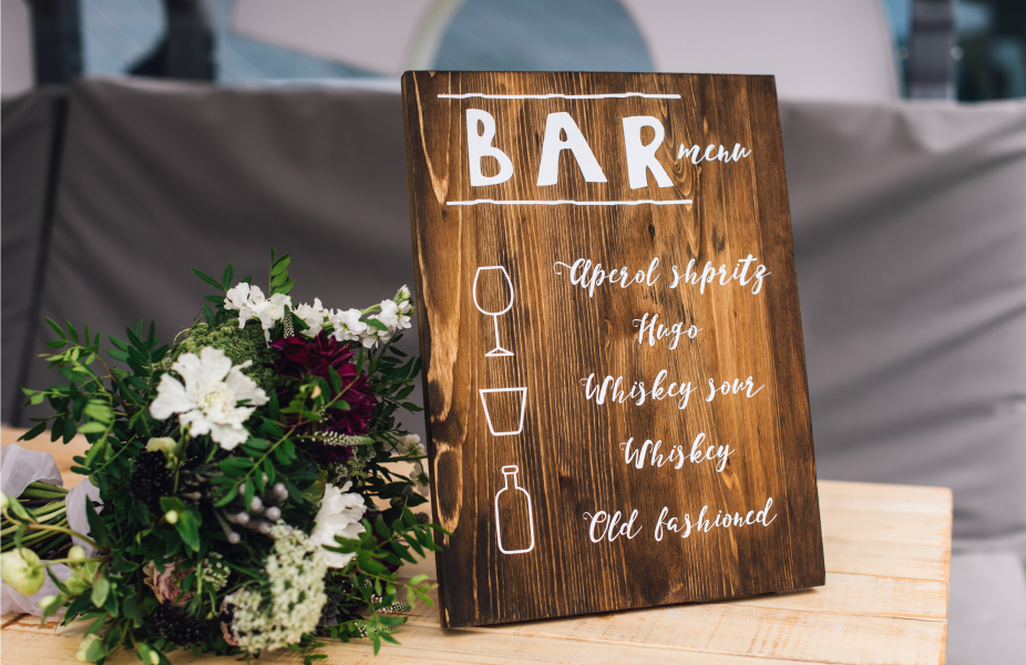 If your wedding is going to have a bar, it will likely be one of the most popular hangout spots in the venue. That means the bar is prime real estate for giving your hashtag maximum visibility. Throw it on the menu or on a little sign on the countertop.